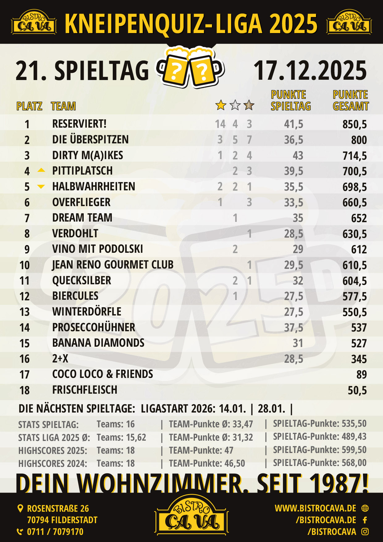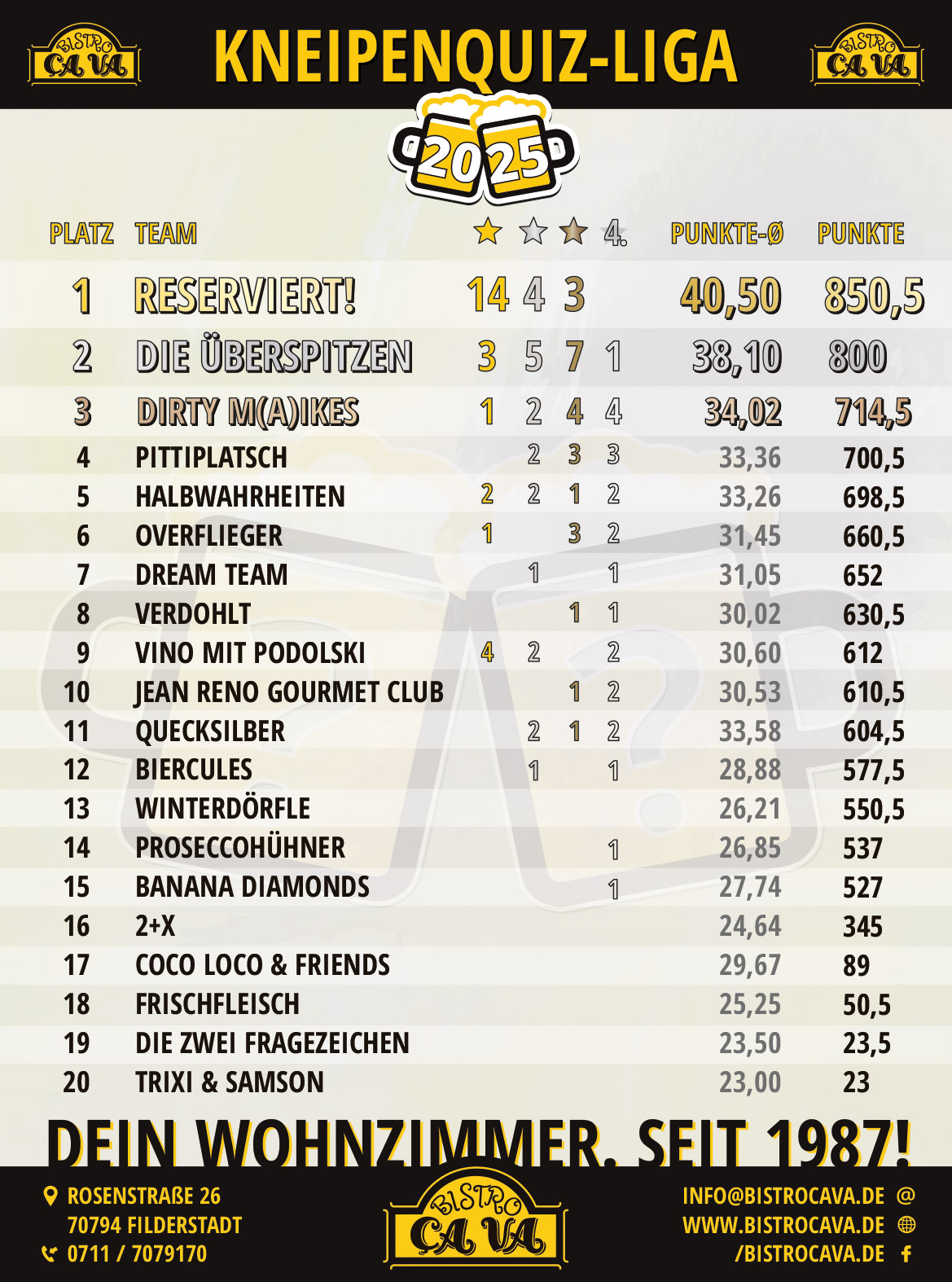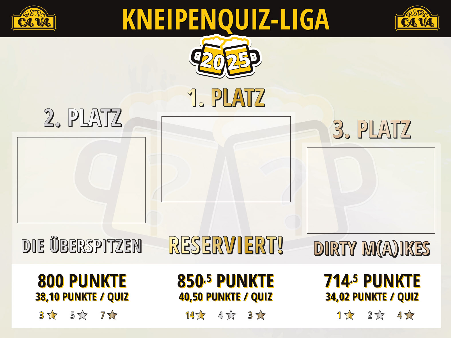 Die ersten drei Plätze in der Jahreswertung erhalten zum Abschluss der Kneipenquiz-Liga im Dezember Jahrespreise.