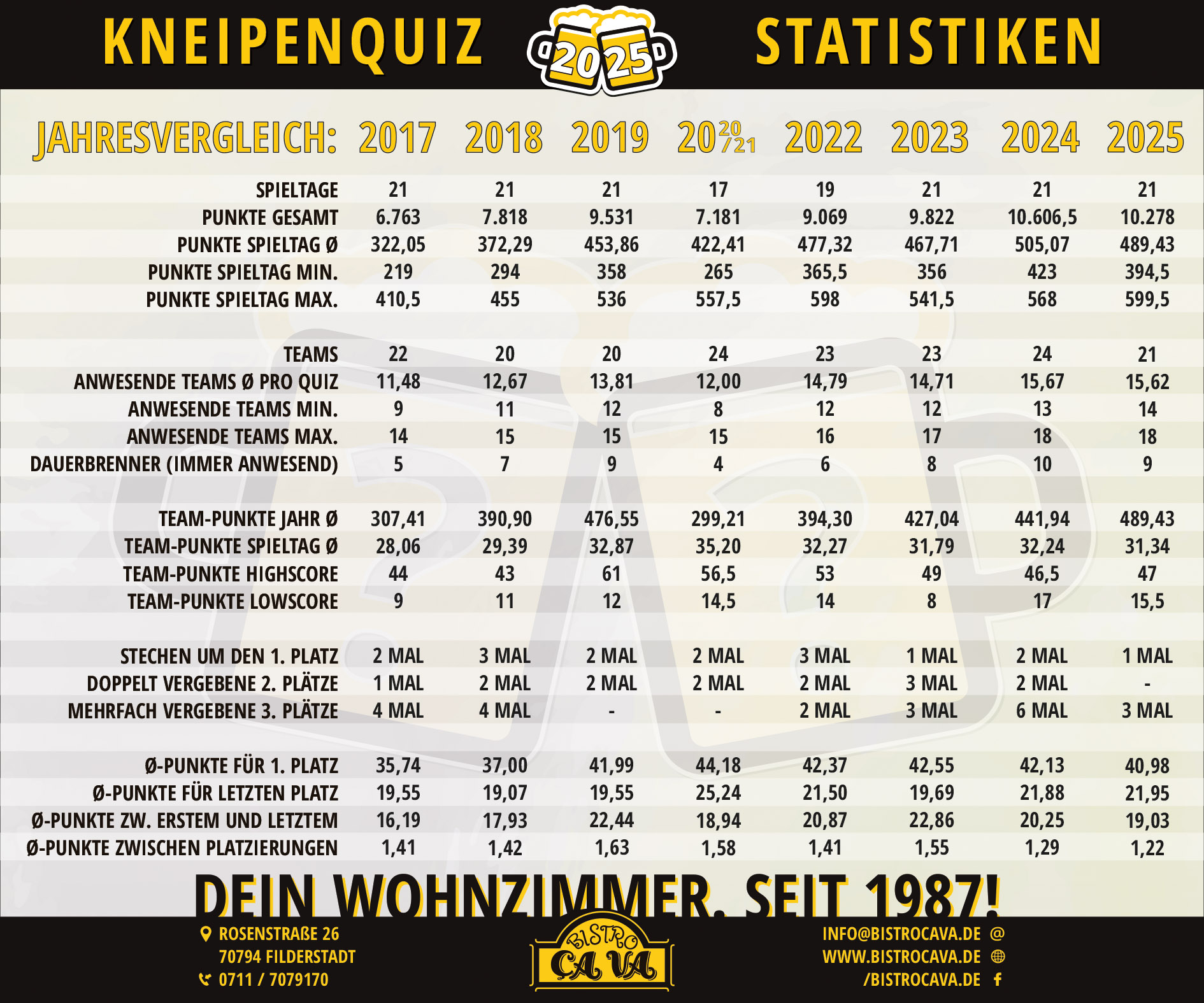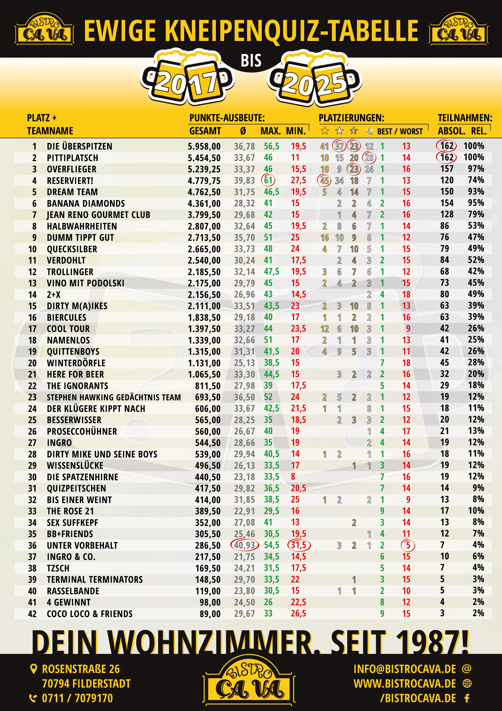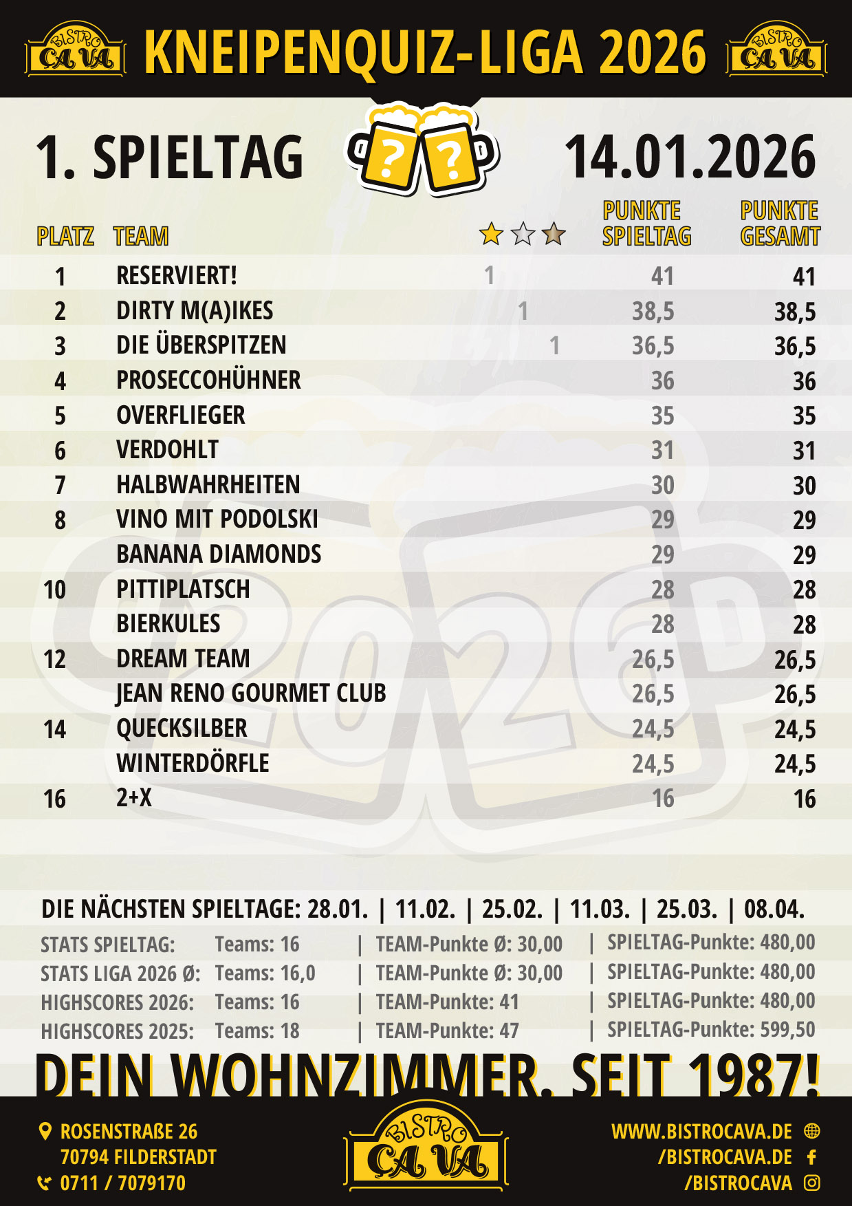 Die ersten drei Plätze in der Jahreswertung erhalten zum Abschluss der Kneipenquiz-Liga im Dezember Jahrespreise.